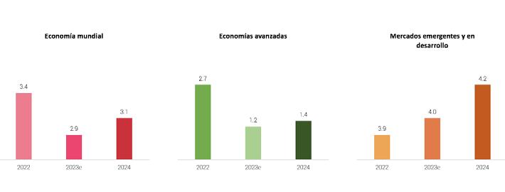 De esta manera, la recesión será inminente en Estados Unidos y Europa, el avance será lento en América Latina, pero Asia se mantendrá resiliente y esto compensará el descenso global. La economía mundial se expandirá en 2.9%, tasa inferior del 3.4% que se espera haya sido en 2022.