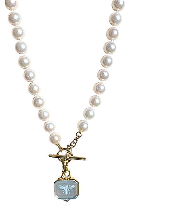 Mazza Company Pearl Necklace with Toggle Clasp; Blue Topaz Backed with Mother of Pearl Carved Bee Enhancer Pendant set in Lustrous 14K with Three Bezel Diamonds Pricing in Store