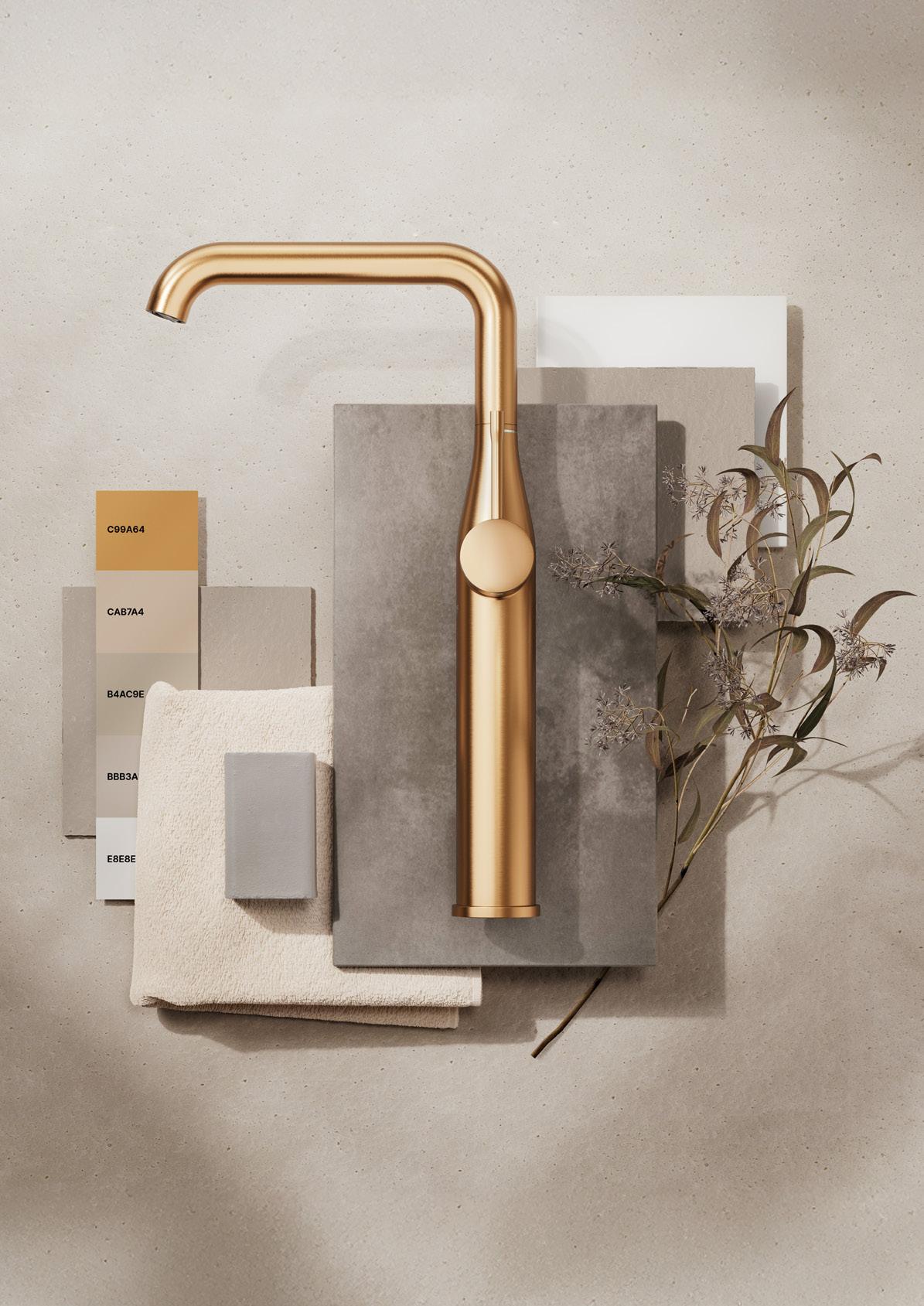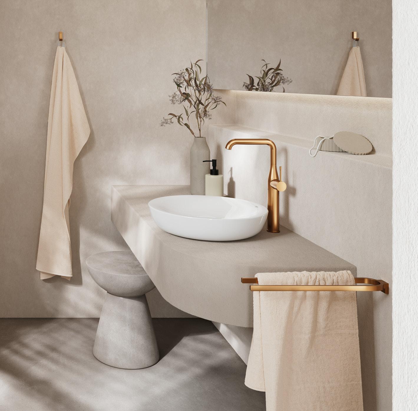 Spice up your bathroom with GROHE Brushed Cool Sunrise taps, showers and accessories! Brushed Cool Sunrise will bring a classic touch to spaces with its elegant, sophisticated, golden look. An all-dark interior will create the most striking contrast. When displayed in a single-material dark-coloured environment, the products in this lovely golden colour will shine with a gem-like effect and will bring a modern yet vintage look. Any furniture or accessories placed around the space should match the interior.