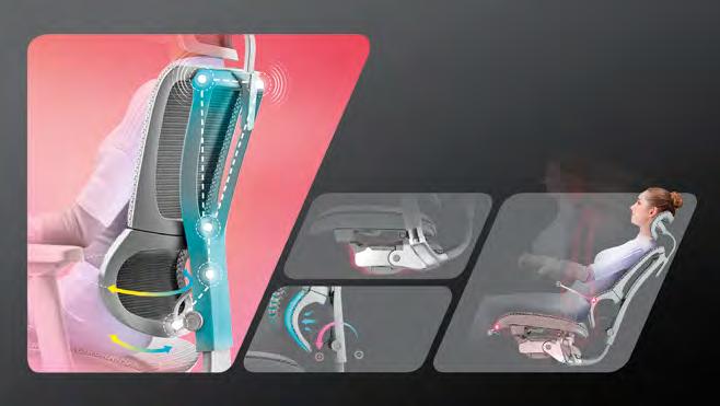 • Alliance entre ergonomie, technologie et design. Les 2 dossiers se déplacent séparément et indépendamment, permettant au corps d’être flexible et mobile. Aucune pression sur la colonne vertébrale. Réel soulagement pour le dos, la musculature, le métabolisme, la circulation sanguine et le système nerveux. Position idéale pour les personnes travaillant de longues heures ou pour celles rencontrant des problèmes de dos.