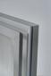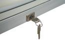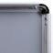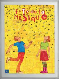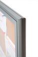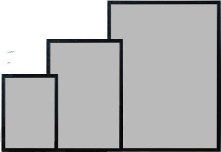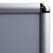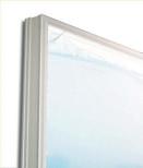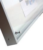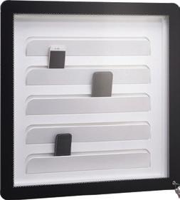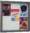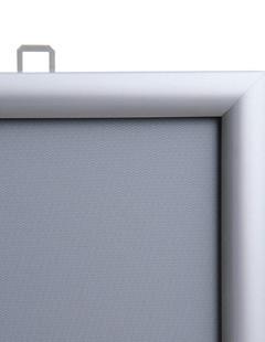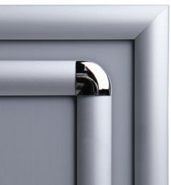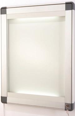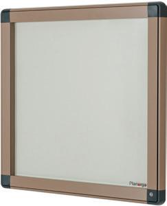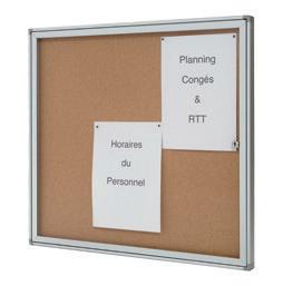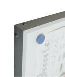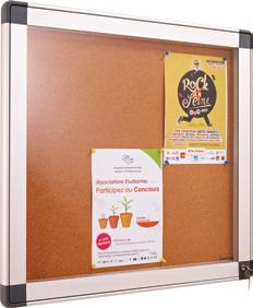 Extra plate 27mm hors tout, 11,8mm utile, cadre alu anodisé, coins arrondis injectés gris, ouvrant plexi de 3mm, serrure. Fond liège ou fond métal.