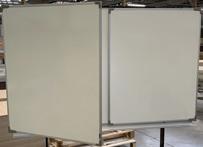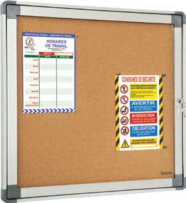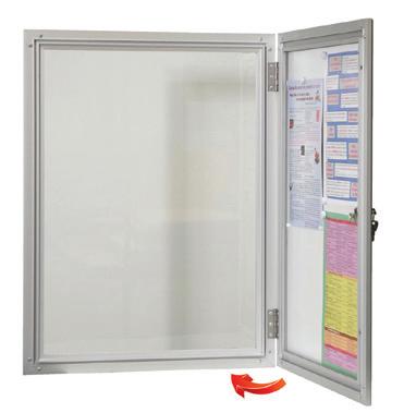 > Charnières sur pivot en laiton. Vitrage securit 4mm ou méthacrylate. Serrure dans le vitrage. Fond magnétique en tôle blanc laqué ou fond liège.