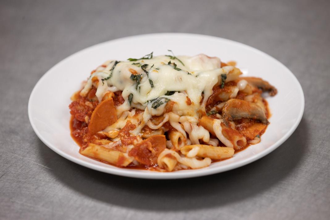 4. In a large mixing bowl, combine cooked pasta, prepared marinara and half of the cheese mixture.