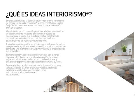 ¿QUÉ ES IDEAS INTERIORISMO®? Empresa dedicada a la decoración, el interiorismo y el diseño de producto. Ideas Interiorismo® se crea en 2004 por Carlos Frejo Selles, que cuenta con una trayectoria de más de 18 años en el sector. Ideas Interiorismo® pone a disposición del cliente su servicio de asesoramiento respecto a cualquier proyecto de decoración y reforma que pueda necesitar, mostrándole recreaciones virtuales de los posibles resultados y adaptándose a las necesidades requeridas. Todo ello no sería posible sin el trabajo y el esfuerzo de todo el equipo que integra Ideas Interiorismo ®; un equipo humano que comparte una misma filosofía, la innovación y la practicidad de sus proyectos. El interiorismo y la decoración son nuestras dos piedras angulares. El interiorismo implica la creación de nuevos espacios prácticamente desde cero, pudiendo idear y desarrollar el proyecto desde sus cimientos hasta su cénit. Frente a la libertad del interiorismo, la decoración supone la realización de diseños originales y el cuidado de los detalles, respetando aspectos tales como estructuras, suelos, ventanas e instalaciones.