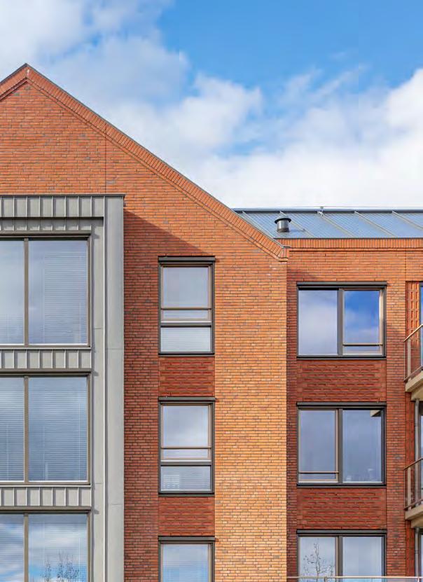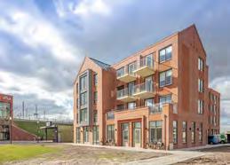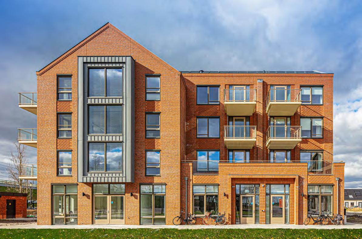 zien dat de bestaande en nieuwe woningen “familie” van elkaar zijn. Er is een stoere rode steen gebruikt, betonbanden die de gevel wat breken en een betonplint. Bij de tweelaagse woningen is een flink dakoverstek gecreëerd met zinken goten. Dit geeft een stoere en natuurlijke uitstraling. Ook het verspringende metselwerk draagt daaraan bij.’