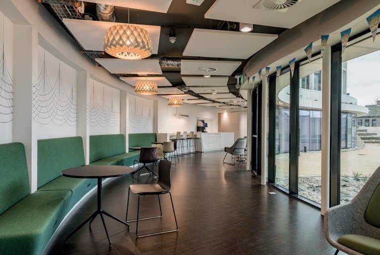 Geluidwerend scherm op dak De luchtbehandelingskasten en warmtepompen zijn op het dak geplaatst. Uit de berekening die vooraf is gemaakt, bleek dat demping van het geluid aan te bevelen was. Naar aanleiding daarvan is tijdens de uit voering een akoestisch scherm meegenomen. Hierover heeft Merford, gespecialiseerd in akoestische oplossingen, zich gebogen. Om de kasten is een scherm geplaatst dat het geluid tegenhoudt en absorbeert. De lange stalen bak van 2,5 meter hoog, met staalplaten en absorptiewol, zorgt voor maximale reductie en is windbestendig. ‘Maar het is geen lelijke puist’, zegt Richard van Tienen, projectleider bij het bedrijf. ‘Het scherm gaat mooi op in de omgeving. Bovendien gaat het lang mee. De architect wilde geen standaardlak, want die gaat verkleuren in de volle zon. Daarom is gekozen voor een superduurzame, UV-resistente poedercoating.’