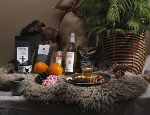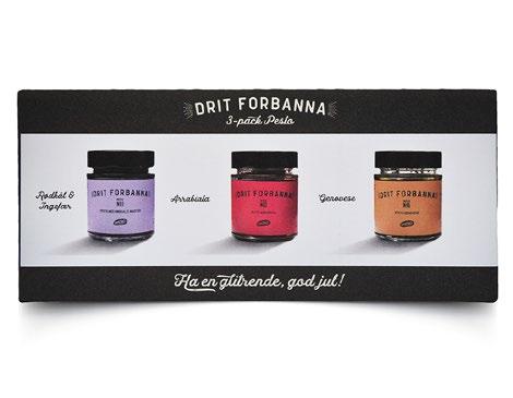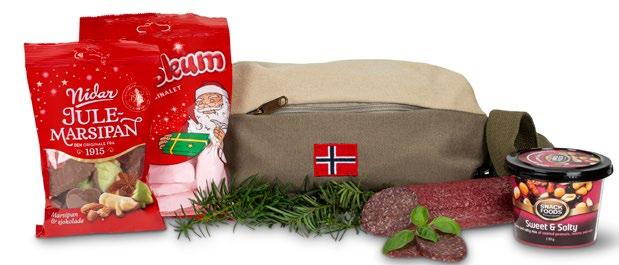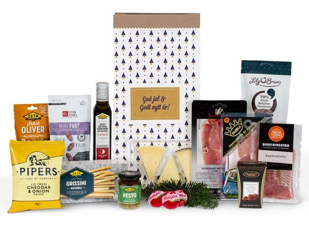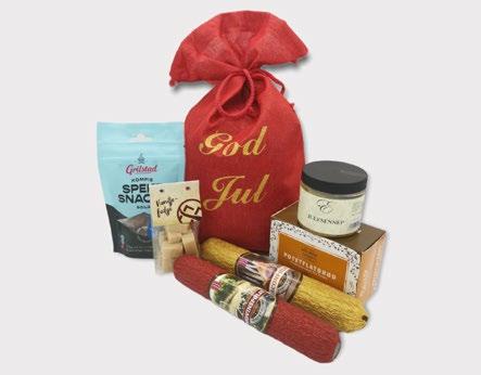 Saltkvern i glass 250 g, Pepperkvern i glass 140 g, Sorte oliven 280 g, Pesto 140 g, Manda rin syltetøy 170 gram, Brødchips rug vårløk og creme fraiche 60 gram, Brødchips rug ost og hvitløk 60 g, Java kaffe 175 g, Eske 300 g, Hasselnøtter med sjokolade og kanel, brente mandler og snemandler Vikingpølse 200 gram, Rødvinspølse 280 gram