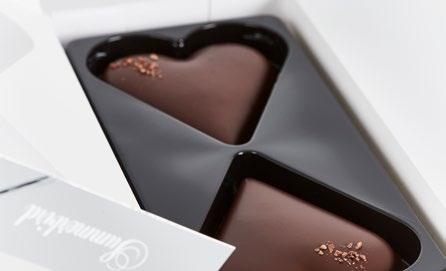 To klassiske hjerter av marsipan på middelhavsmandler, trukket med et tykt lag mørk sjokolade Amazonas 61 % og strødd med en smule lett ristede, knuste kakaobønner.