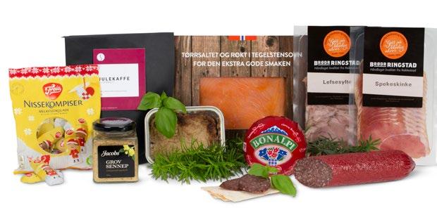 Inneholder:Lefsesylte Skåret 100g, Julepostei Ovnsbakt 200g, Edamer Rund 250g Uhrenholdt, Jacobs Sennep Grov 180g, Norsk Spekeskinke Skivet 100g, Rødvinspølse Snabb 260g, Røkt Laks Skivet i Gavesjaktel 150g, Julekaffe Filtermalt 200g, Nissekompiser 120g, Juleeske Medium