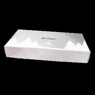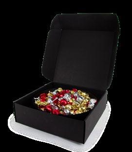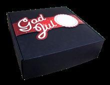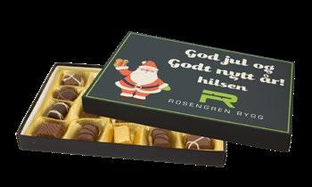 Din egen logo og julehilsen trykkes på lokket og leveres med belgisk konfekt som innhold. Konfektesken kommer i fargene sølv, gull, sort og hvit. Alle eskene leveres med hvit bunn.