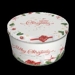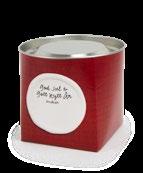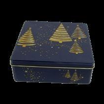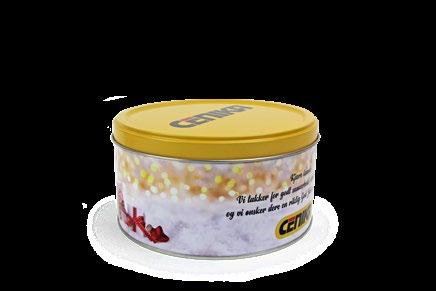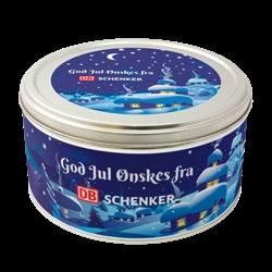 Boks i kartong med metallokk. Boksen fylles med merkevaregodt, pralinkuler eller Lübecker marsipan. Egen logo og julehilsen trykkes direkte på boksen.