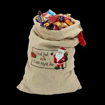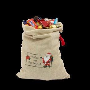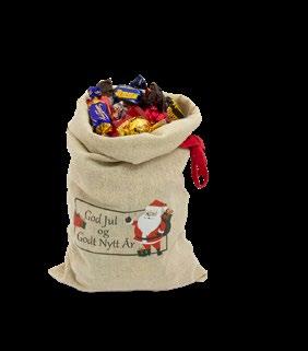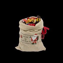 Våre nye julesekker får du med ditt helt eget trykk på fronten av sekkene. Sekkene lukkes med en sort snor og finnes i 3 ulike størrelser. Også her kan du velge mellom merkevaregodt eller pralinkuler som innhold.