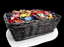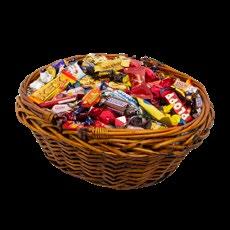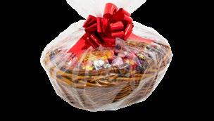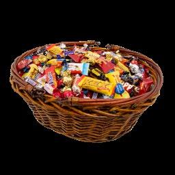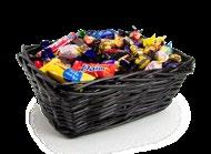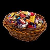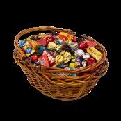 Kurver i 3 størrelser fylt med merkevaregodt eller pralinkuler. Kurvene pakkes inn i cellofan og påsettes sløyfe som standard. Kort med eget trykk og hilsen kan legges i kurven.