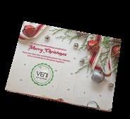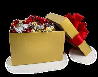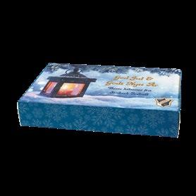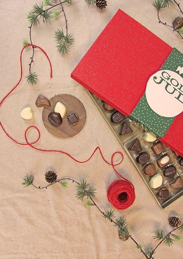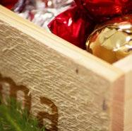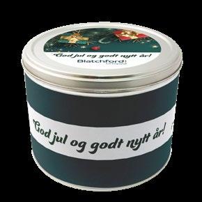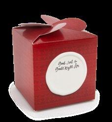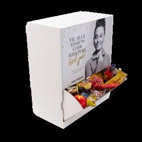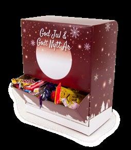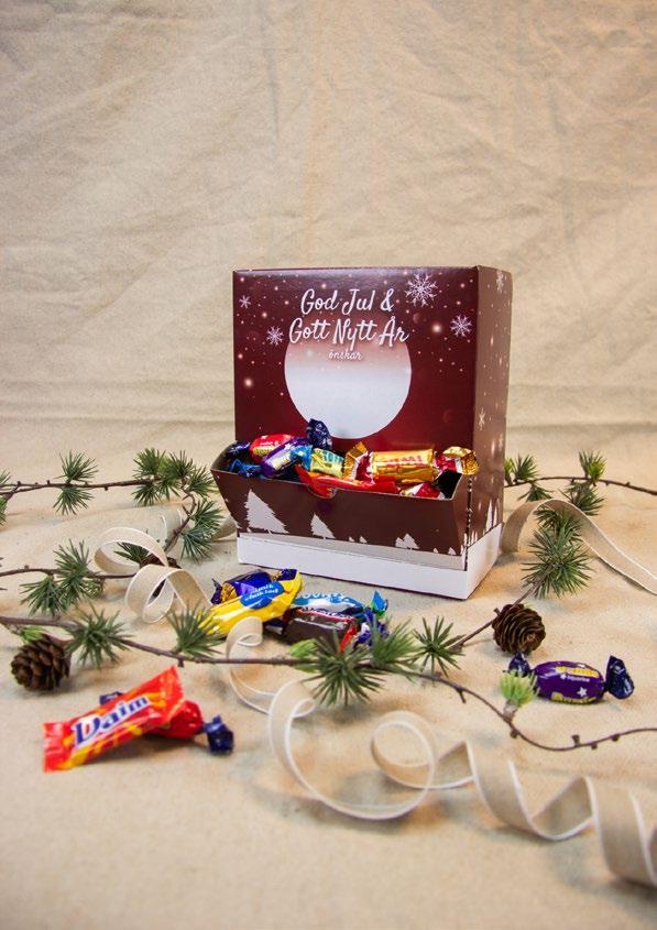 Displayboksene leveres med merkevaregodt eller pralinkuler som innhold. En etikett med din egen logo og julehilsen monteres på boksens front.