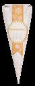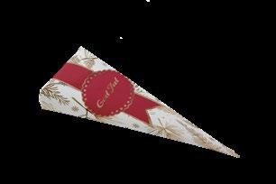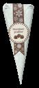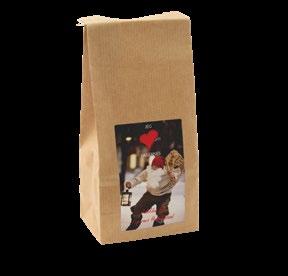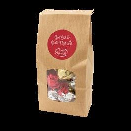 Brun papirpose med bastsløyfe og etikett påtrykket helt eget design festes i front. Posen leveres med merkevaregodt, pralinkuler eller Lübecker marsipan som innhold. Posen fås med eller uten vindu.