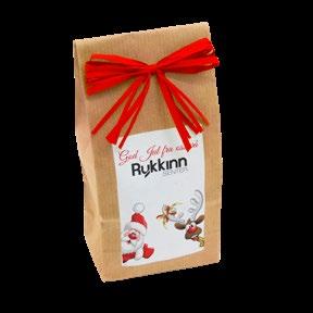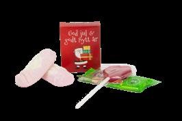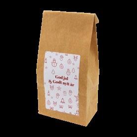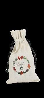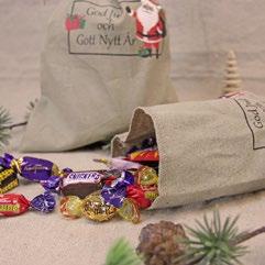 Sekkene fylles med merkevaregodt eller pralinkuler og kommer i 4 størrelser. Logo og julehilsen trykkes på et kort som festes i snoren på sekken.