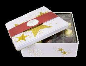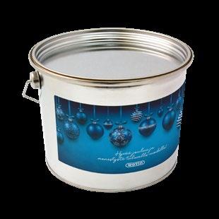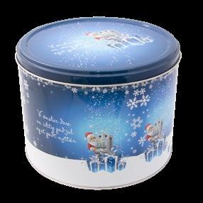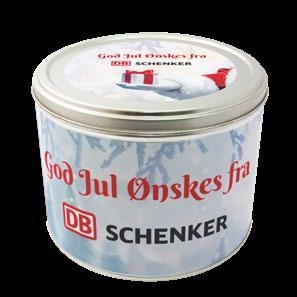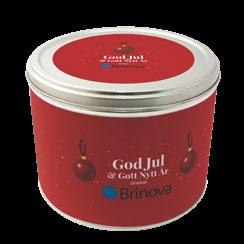 Lekker metalleske som leveres med belgisk konfekt eller pralinkuler som innhold. Logo og julehilsen trykkes på en banderoll som festes rundt eskens lokk. Leveres i fargene blå og hvit.