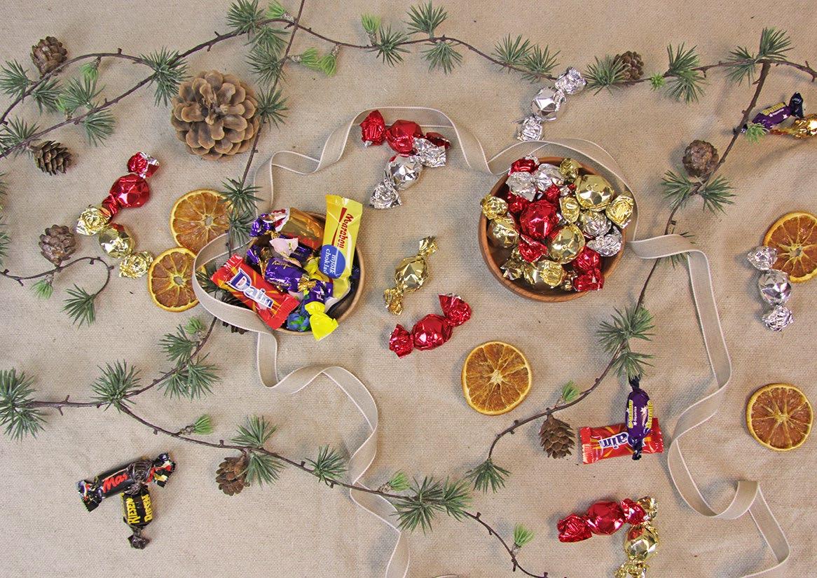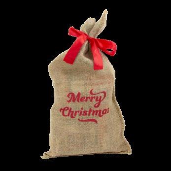 Sekkene fylles med merkevaregodt eller pralinkuler og kommer i 3 størrelser. Logo og julehilsen trykkes på front av sekkene.