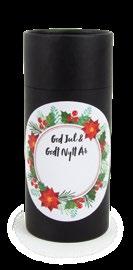 Sort rør i kartong som fylles med deilige sprø pepperkaker fra Nyåkers. Pepperkakene er pakket i transparent folie før de legges i røret. Logo og julehilsen trykkes på en rund etikett som festes i front.