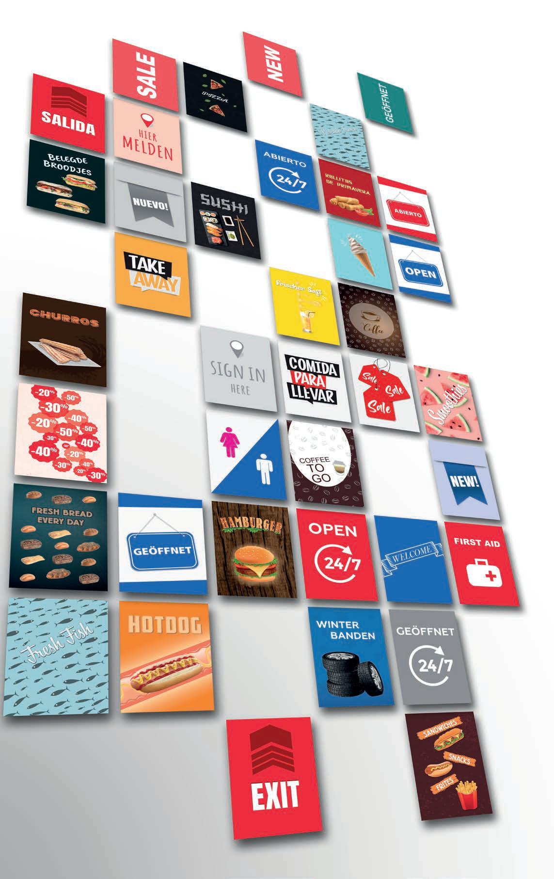 New in our assortment: complete product sets with standard print designs. Make it easy for your customers to order a promotional display. From Snap Frames to Zipper-Walls to suit different markets such as Hospitality, POS, Office and Events.