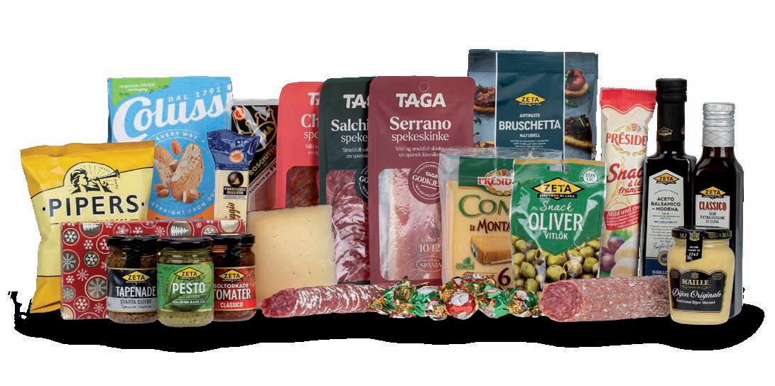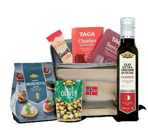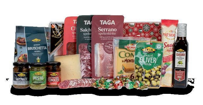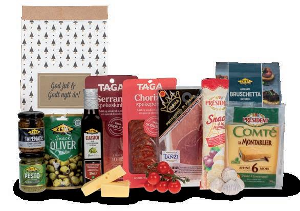 Innhold: Sætre Beste speltkjeks, Bruschetta naturell 175g, Lesgards Marmelade Brie, President Camembert 250g treeske, Parmaskinke 40g, President brie 125g, President Comté AOP 200g, Rødvinspølse 200g, Salchichon 225g, Serrano skinke skivet 55g, Chorizo spansk skivet 100g, President Gourmet Butter Sea Salt 250g, Grønne snack oliven hvitløk 70g, Societe Roquefort 100g, Røros juleost 90g, Olivolja Ex Verg-Classico 0,25l, Balsamico 250ml, Pesto Alla Genovese 140g, Tapenade sorte oliven 140g, Potetflatbrød 210g, Røros velagret kvitost 90g, Castello blå 5x20g, Pipers Cheddar & Onion 40g, Westfaler Spekeskinke 70g, Aksie fjøl 95cm.