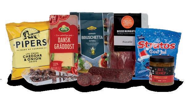 Innhold: Julesennep 200g, Dansk greddost skivet 125g, Ringstad Fenalår 100g, Pipers Cheddar & Onion 40g, Holmens brente mandler 100g, Bruschetta naturell 175g, Fårepølse 270g, Stratos Julefigurer 140g.