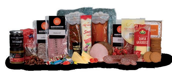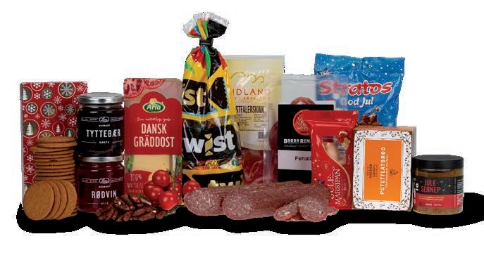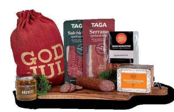 Innhold: Dansk greddost skivet 125g, Twist 145g, Rødvinspølse 200g, Westfaler Spekeskinke 70g, Rødvin gele gourmet Lisa 280g, Potetflatbrød 210g, Nidar marsipangris 65g, Holmens brente mandler 100g