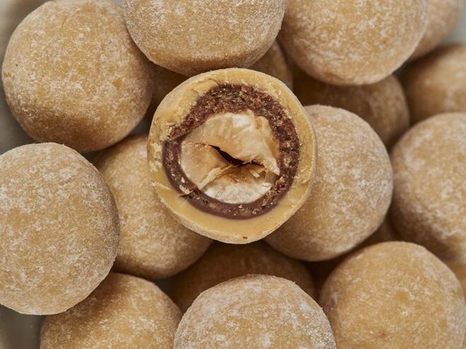 Lightly roasted organic Italian hazelnuts, coated in praliné, Amber Noir chocolate with a dusting of the finest powder of sun-ripened blackberries. A hazelnut with fruitiness and acidity from the sun-ripened blackberries, depth from the caramelised Amber Noir chocolate and umami from the crunchy Italian hazelnuts.