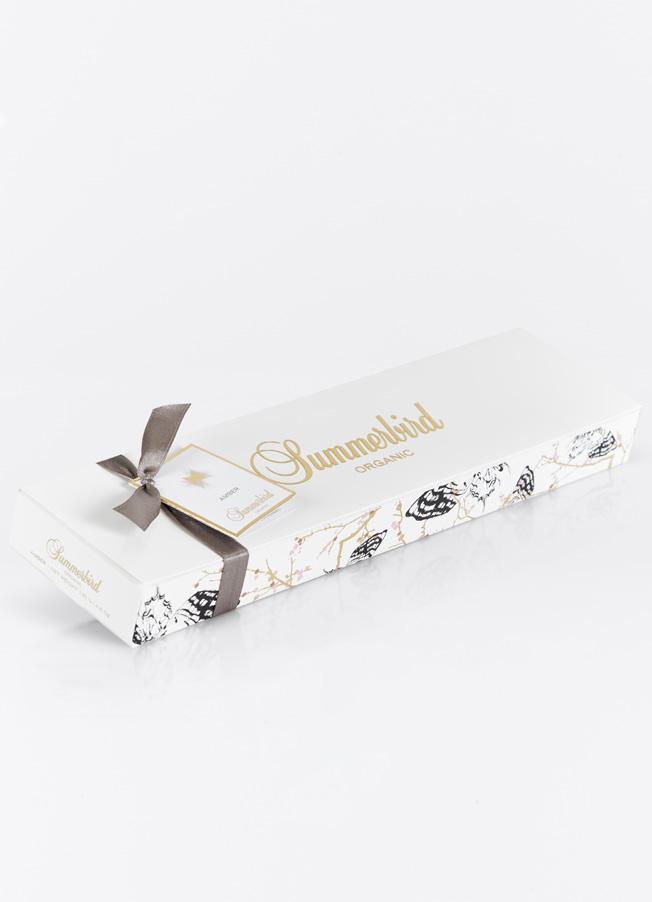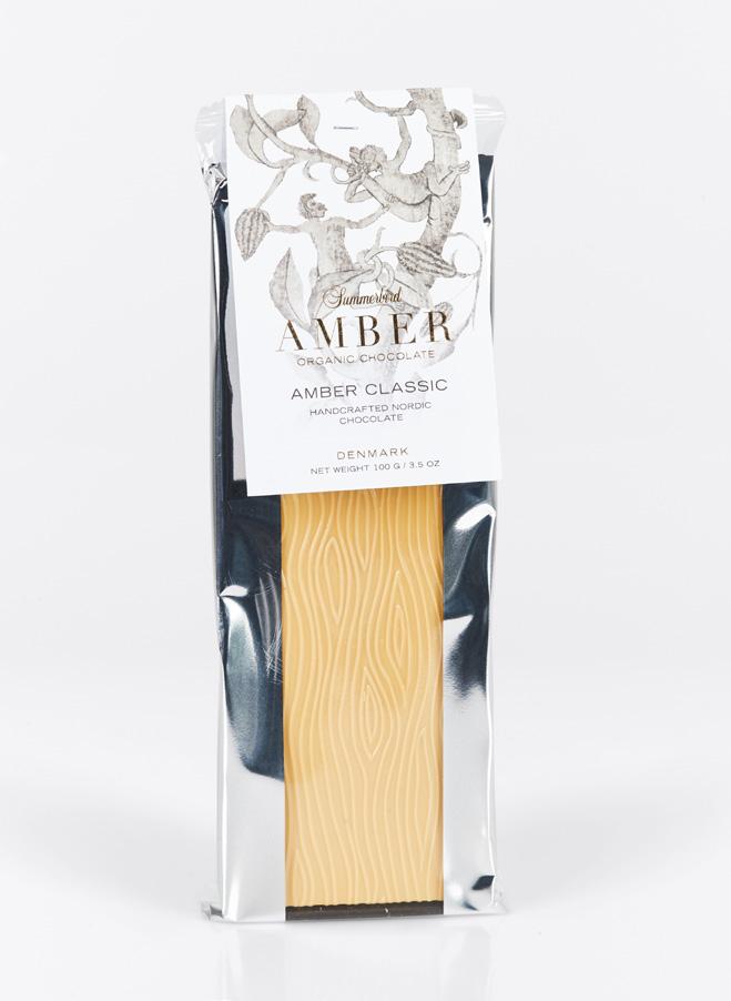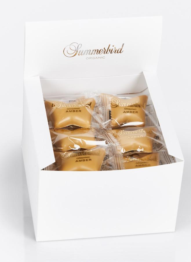 Our Amber Classic chocolate, with its unique golden amber colour, silky smooth texture and caramelised taste, has won several gold medals at the European Chocolate Awards. We have assembled four of our most popular Amber varieties in an elegant and exclusive gift bag, all containing Amber Classic chocolate. The bag contains one Amber Croquant bar, one bag of Amber Dragée, four Amber Summerbirds and one Amber Miniature gift box.