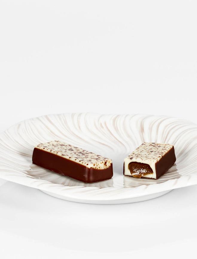 Caramel ganache flavoured with Italian liquorice from Calabria, encased in our aromatic and fresh white chocolate, White Vanilla. A petit four with intensity and depth from the combination of the Italian liquorice, caramel ganache and the fresh and aromatic white chocolate.