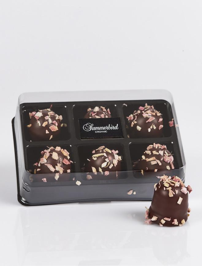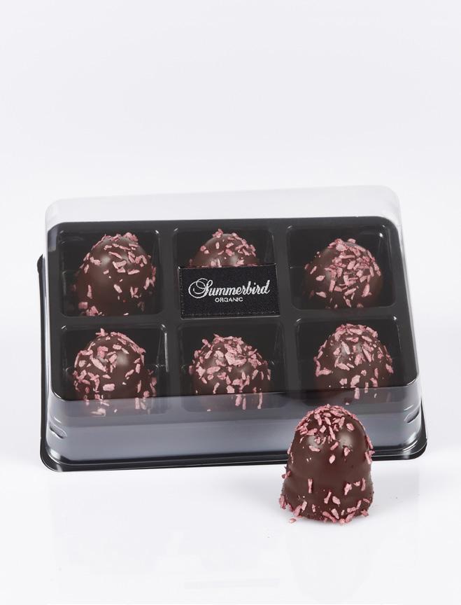 Marzipan base of stoneground Mediterranean almonds and dark chocolate, topped with Italian cherry meringue flavoured with an abundance of vanilla, coated with a thick layer of dark chocolate Amazonas 61% and sprinkled with coconut, then rolled in cherry powder. A cream puff with aromatic and fruity flavours from the combination of the luscious marzipan and chocolate base, the light cherry and vanilla meringue and our deep dark chocolate.