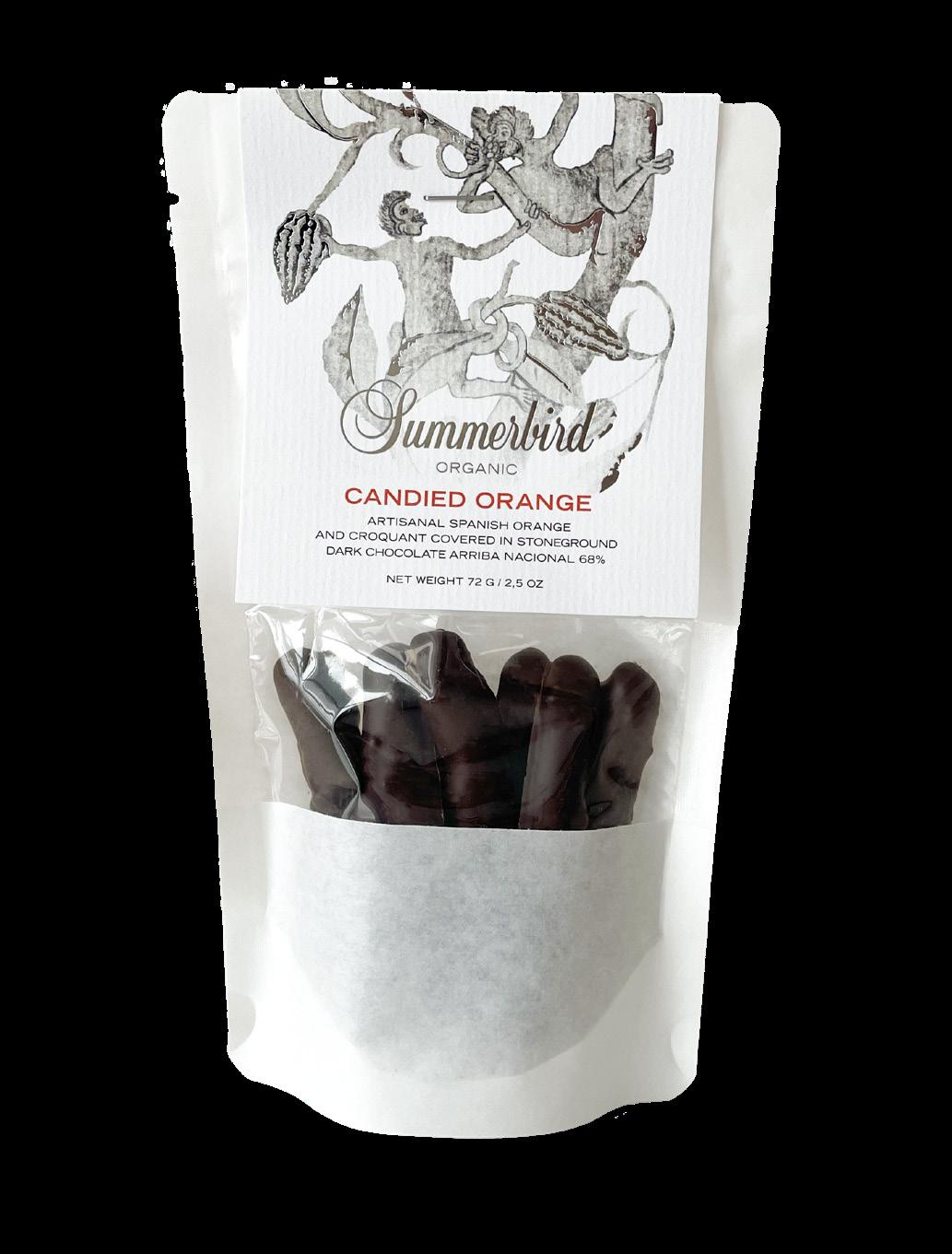 Candied peel of sun-ripened organic oranges from Spain, coated with a thick layer of dark chocolate Arriba Nacional 68 % and crushed caramel.