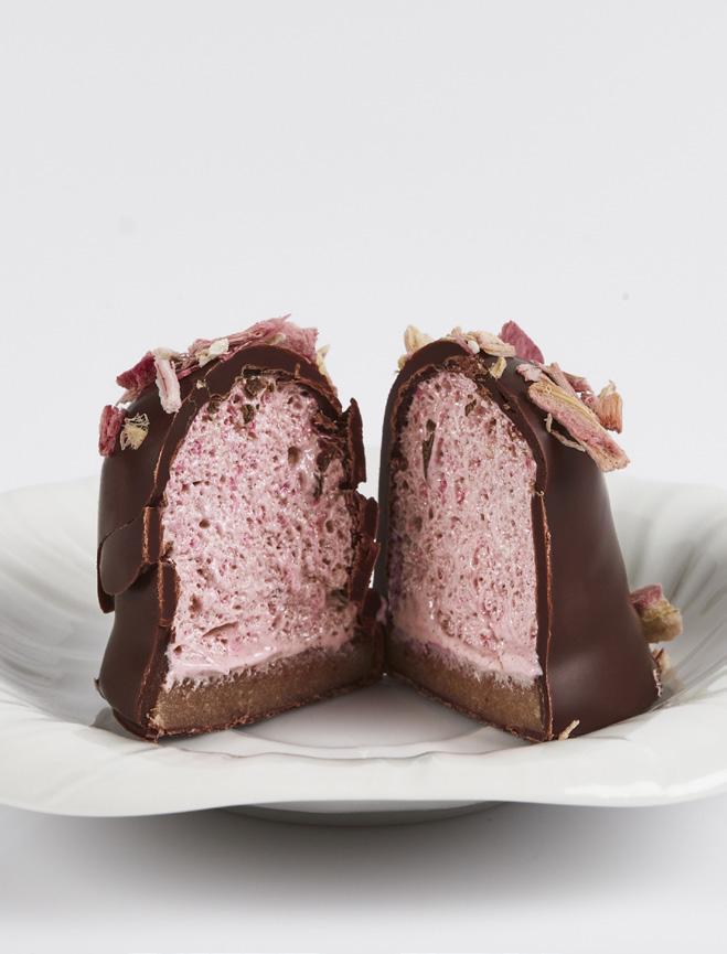 A marzipan base of stone-rolled Mediterranean almonds topped with Italian meringue flavoured with generous amounts of strawberries and vanilla and coated with a thick layer of dark chocolate Amazonas 61% and then sprinkled with rhubarb. A cream puff where the pure and luscious marzipan, the fruity strawberry/vanilla meringue and the characteristic dark chocolate meet in a unique and delicate balance.