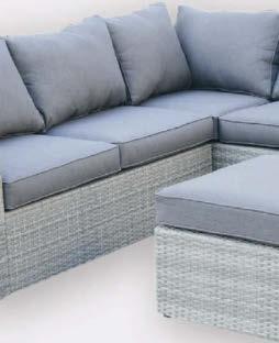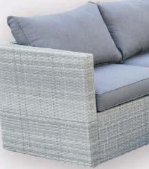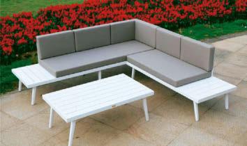 Sofabord L: 120 x D: 60 x H: 45 cm. Siddehøjde 40 cm. Sofa og stolene har klapbord-funktion i den højre side. Pulverlakeret hvidt aluminium +10 cm hynder.