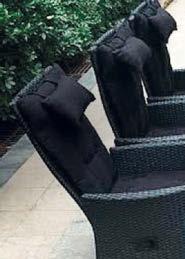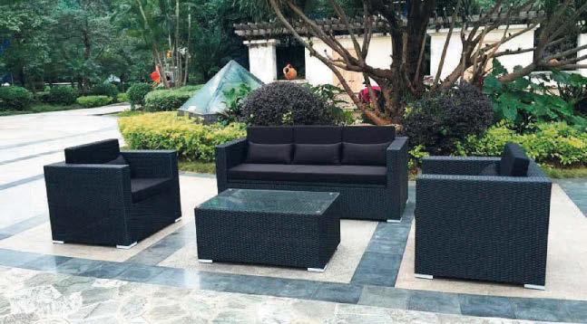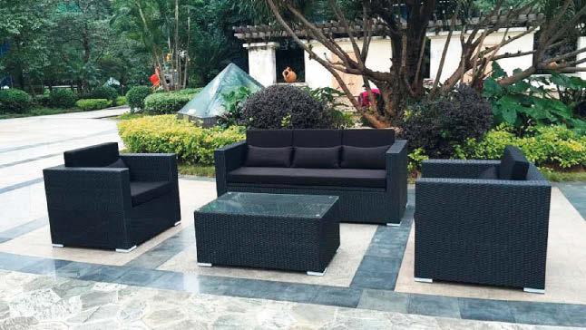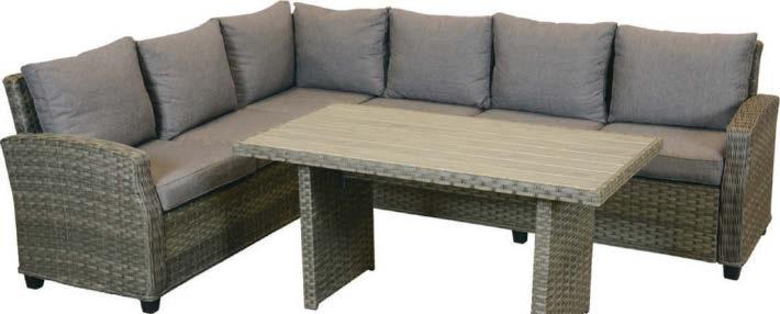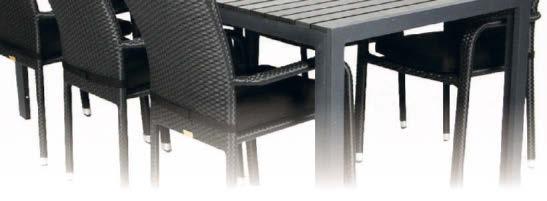 Model Daneline. Pulverlakeret beige/brun aluminiums stel, flettet med kraftigt, naturfarvet polyrattan. Bordplade med 8 mm hærdet glasplade. Bord mål: L: 180 x B: 105 x H: 75 cm. Polyrattan stole med tykke, brune hynder og vandafvisende stof. Siddehøjde 43 cm + hynde 5 cm – i alt 48 cm. Vedligeholdelsefrie materialer. Stol mål: H: 90 x B: 60 x D: 65 cm.