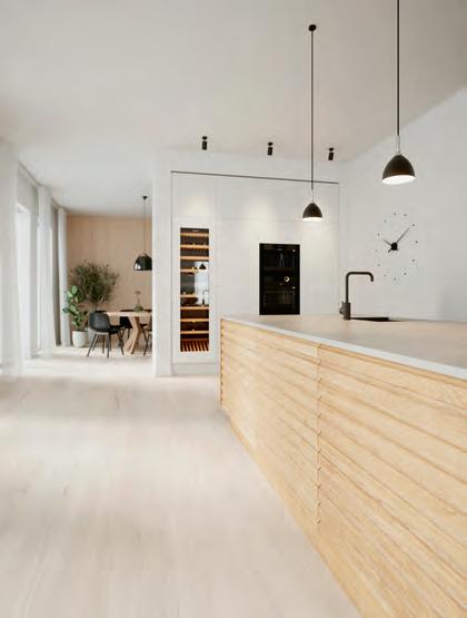 Lamellfronter i rustikk mørk eik er et elegant valg som løfter kjøkkenøya og gir den et nesten skulpturelt uttrykk. Her kombinert med integrert vinseksjon og grå skap med diskret push-funksjon. Tekst Redaksjonen — Foto Designa