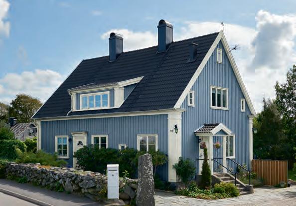 BLÅTT Blå er tradisjonelt sett ikke en vanlig husfarge, men fler og fler ønsker å male huset sitt blått. Dempede blåfarger fungerer utmerket som utendørsfarger. Vær imidlertid oppmerksom på at blå er en av de fargene som endrer seg veldig mye fra fargeprøve til husvegg. Vær derfor helt sikker på fargevalget før du maler hele huset. Det er også stor forskjell på det uttrykket en dempet blåfarge gir, sammenlignet med en kraftig nyanse. FARGETIPS: Fargerike Midnattsblå FR5085: Dette en en fin dempet blåfarge som også fungerer godt sammen med hvit staffasjefarge. Nordsjö Embracing blue: Dersom du ønsker en mer mellomblå farge, kan Embracing Blue fra Nordsjö være noe for deg.