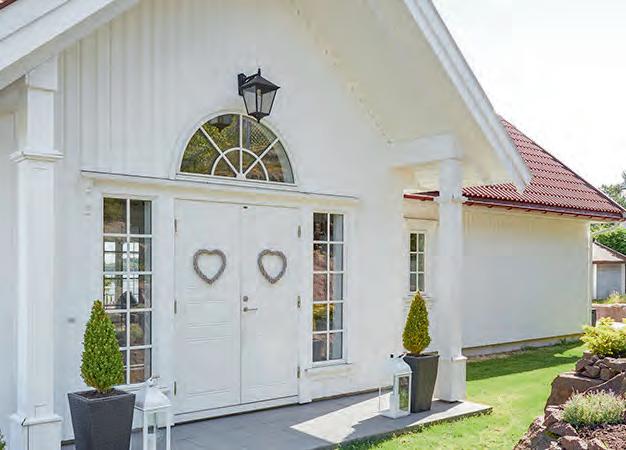 HVITT Hvit er en husfarge som er veldig interessant, til tross for at den kanskje forbindes som en trygg og “vanlig” husfarge. Et hvitt hus kan nesten virke selvlysende i solskinn dersom det er valgt en ren hvit farge. Hvit kan også fremheve form og størrelse ved at den tydelig markerer forskjeller mellom skygge og lys. Dersom du ikke ønsker en ren hvit farge, anbefales det å tilsette litt gult til blandingen. FARGETIPS: Jotun 1001 Egghvit: Egghvit er fargen for deg som ønsker en helt hvit fasade. Denne fargen er dempet og har en gulaktig hvit tone, og dermed ikke “skrikende” hvit. Den vil likevel oppleves som helt hvit utendørs.