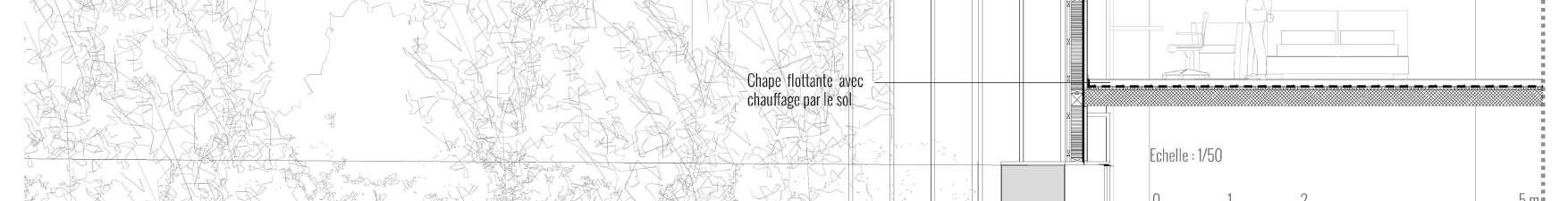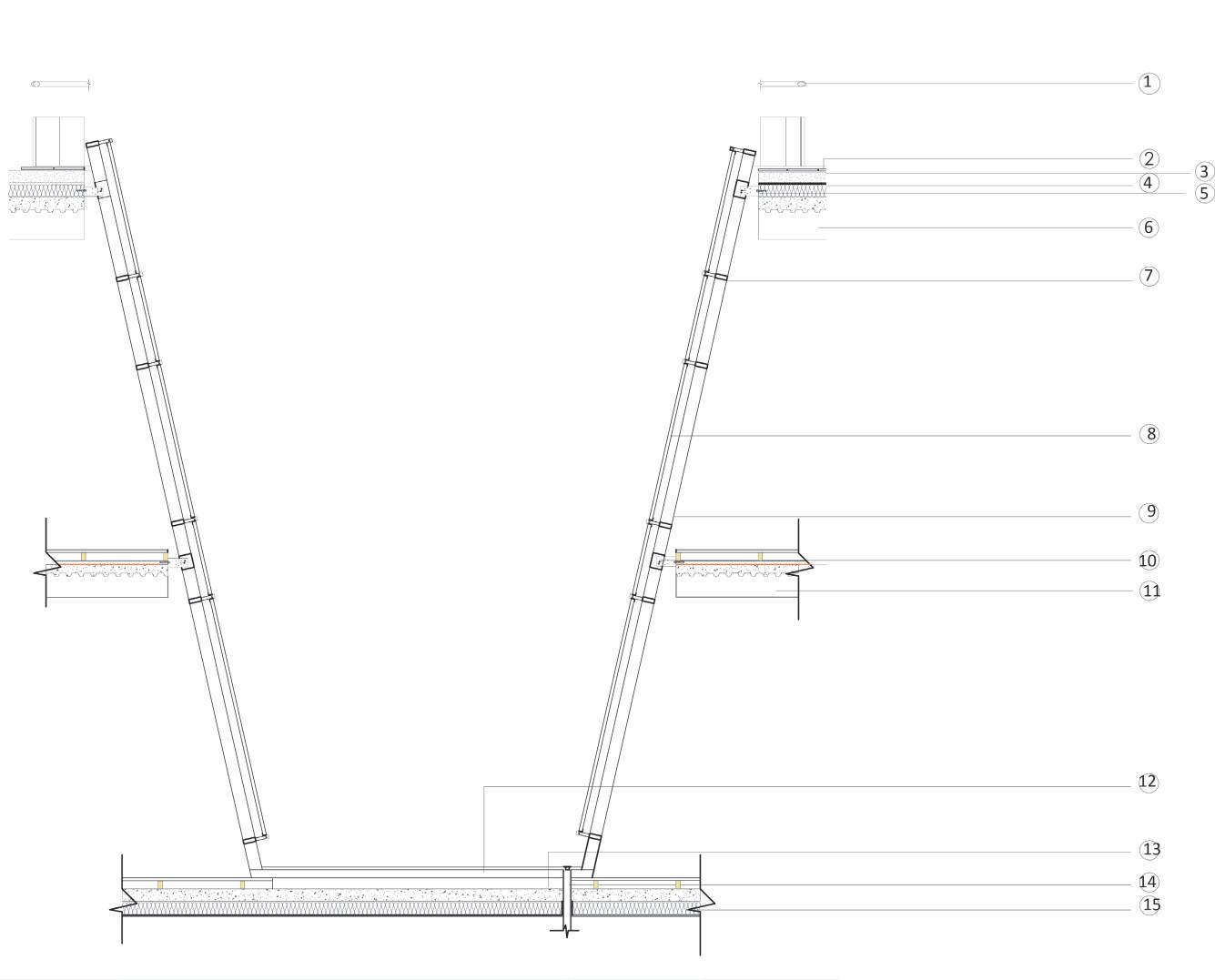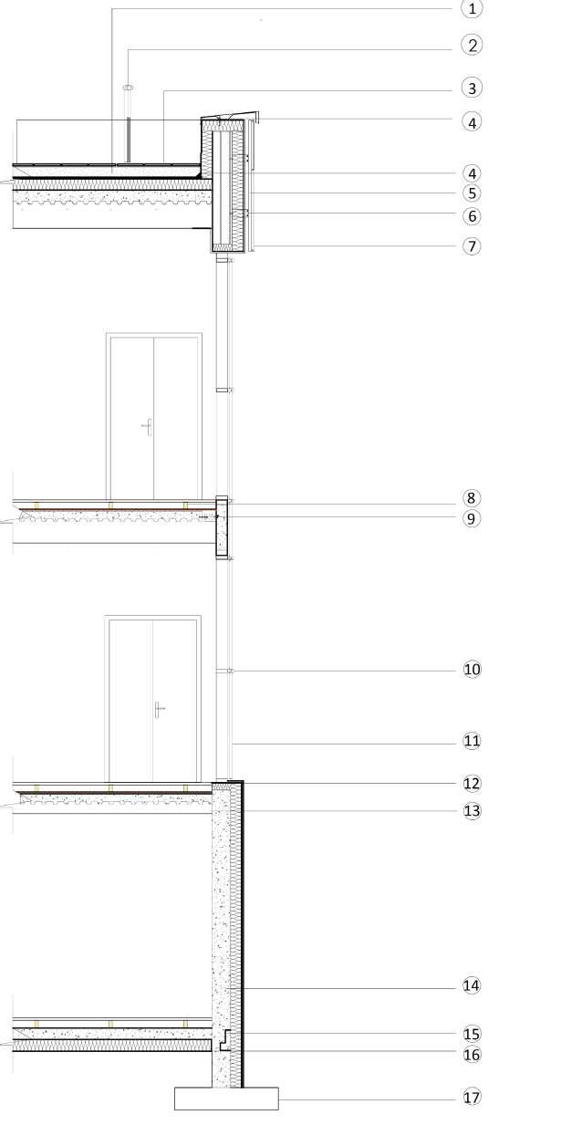 1:Garde corps 2:Dallettes 3:Chape béton 4:Etencheité 5:Equerre de fication 6:Retombée poutre 7:Meneau horizontal 8:Double vitrage 9:Meneau vertical 10:Equerre de fixation 11:Retombée de poutre 12:Complexe d’etancheité 13:Chape 14:Plancher industriel 15:Isolation