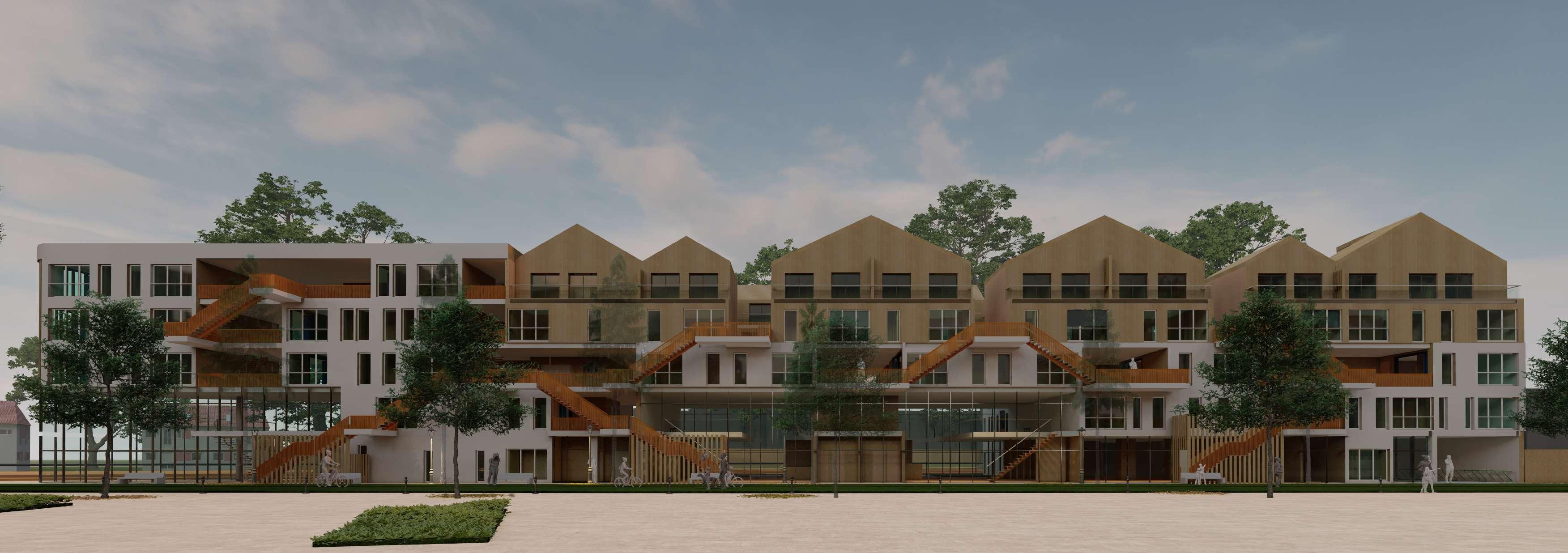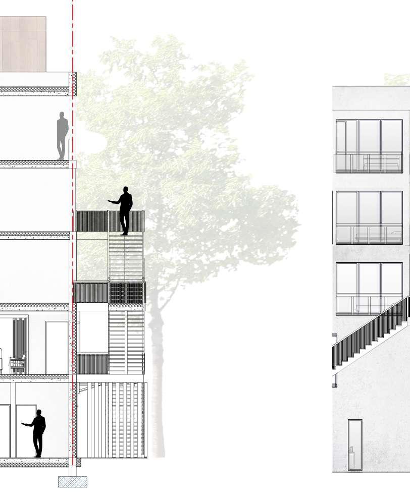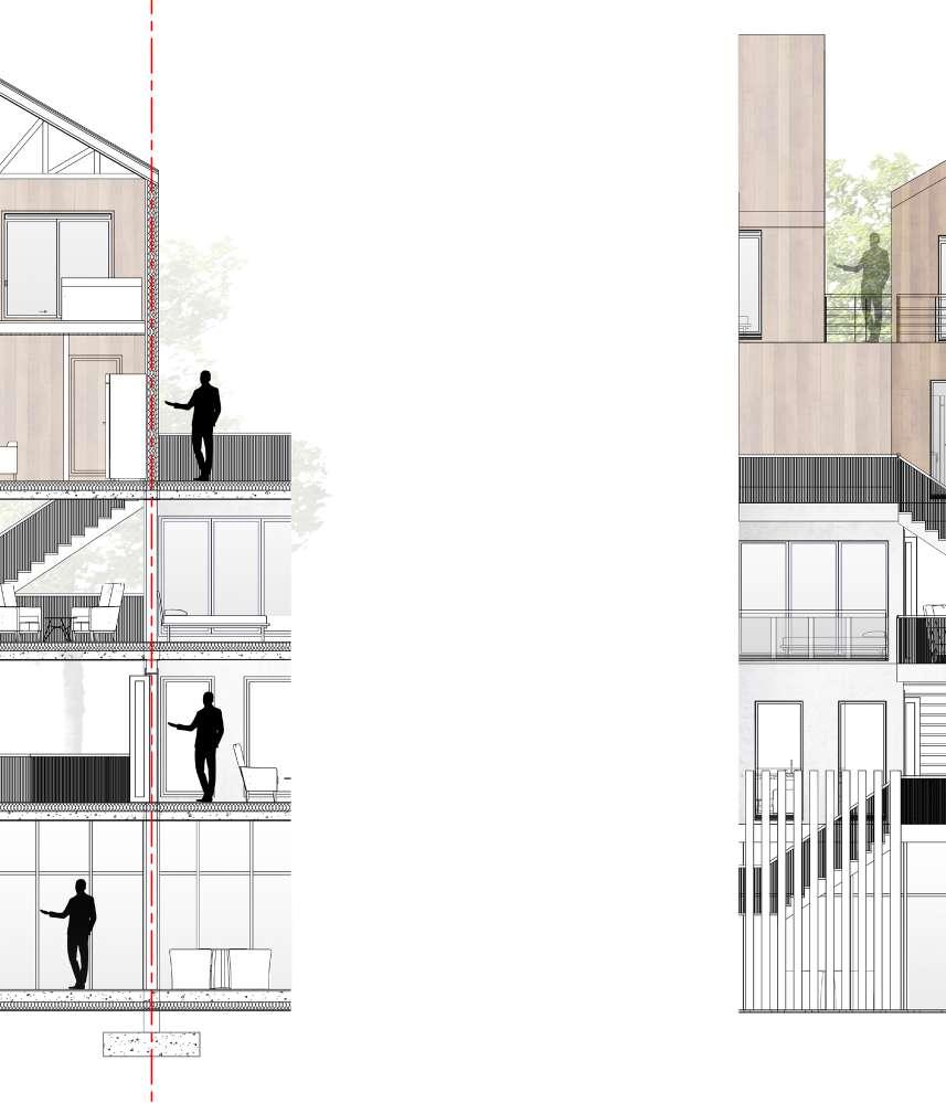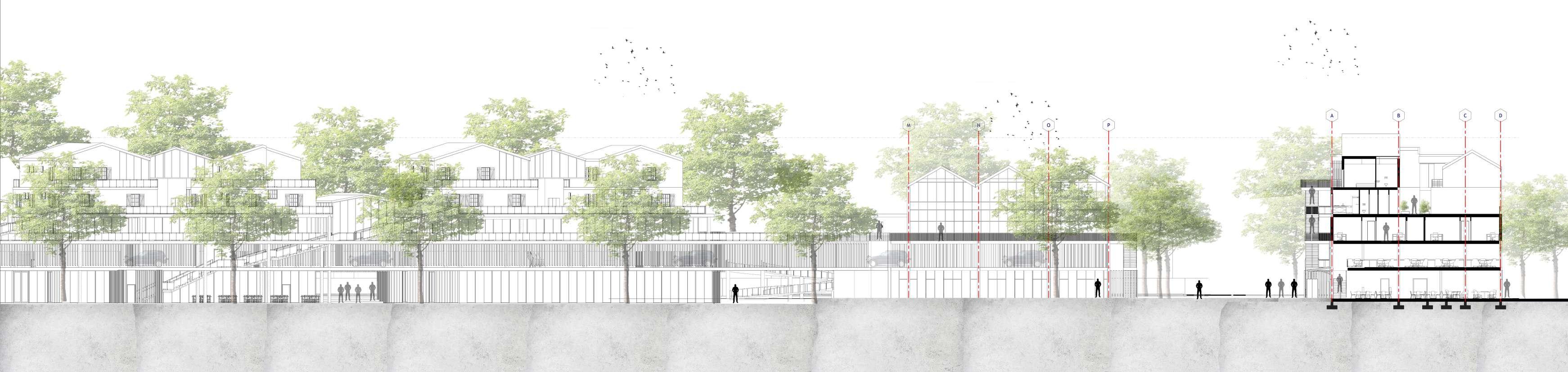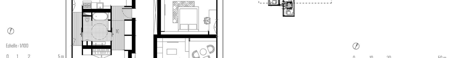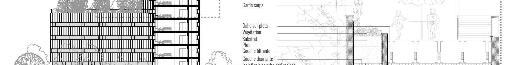 Situé au Niveau des sept îles à Montfermeil, ce projet consistait à repenser l’entrée de la ville marquée par le centre commercial d’Auchan et son parking formant un grand ensemble imperméable. Ce site est également traversé par un parcours historique qui est la promenade de la Dhuys. Notre projet consistait à marquer cette entrée en mettant en place un îlot commercial en proposant une diversité programmatique. Les rez de chaussée étaient dédiés à des programme de proximité tels que des cafés, une pharmacie et une boulangerie. Les étages quant à eux sont dédiés à des logements partagés et des duplexes tout en bois pour des familles directement connectés à la place et la promenade de la Dhuys à travers une série d’escaliers sur la façade.