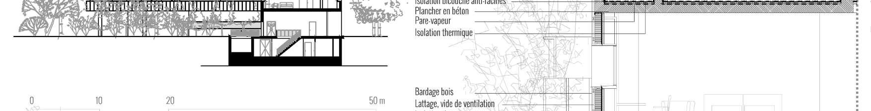 Ainsi le rez de chaussez sera complètement vitré, le premier étage étant dans les feuilles aura plutôt des ouvertures qui s’adapterons a cette lumière tamisée et la toiture profitera de la vue que laisse la canopée des arbres.