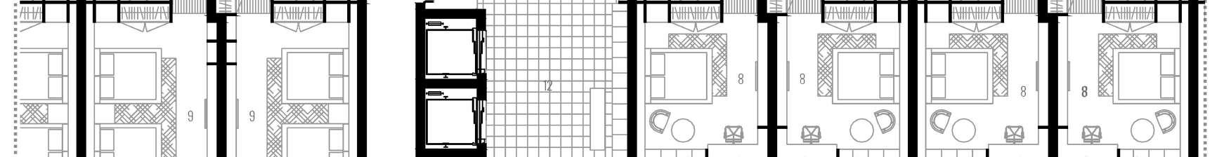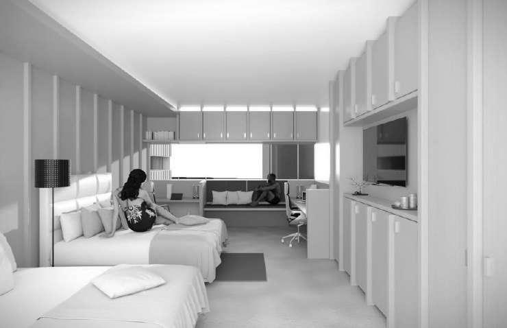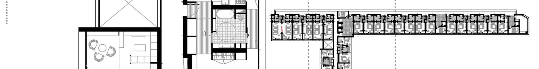 Notre proposition comprend une chambre type qui se décline en trois variantes dont une chambre double, une suite et une typologie de chambre constituées de deux chambres adjacentes pour les groupes avec une spécificité de pouvoir se transformer en deux chambres de couchage séparées la nuit et en un seul grand espace la journée.
