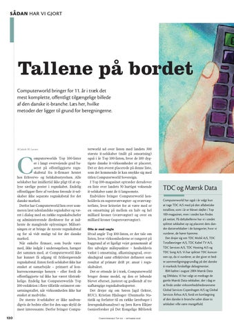 omputerworlds Top 100-lister er i langt overvejende grad baseret på offentliggjorte regnskabstal fra it-firmaer hentet hos Erhvervs- og Selskabsstyrelsen. Alle selskaber har imidlertid ikke pligt til at oplyse særlige poster i regnskabet. Endelig offentliggør flere af verdens førende it-selskaber ikke separate regnskabstal for det danske marked. Derfor har Computerworld hen over sommeren læst udenlandske regnskaber og været i dialog med en række regnskabschefer og administrerende direktører for at indhente de manglende oplysninger. Målsætningen er at bringe de nyeste regnskabstal og for så vidt muligt tal for det danske marked. Når enkelte firmaer, som burde være med, ikke indgår i undersøgelsen, hænger det sammen med, at Computerworld ikke har kunnet få adgang til fyldestgørende regnskabstal. Enten fordi selskabet ikke har ønsket at samarbejde – primært af konkurrencemæssige hensyn – eller fordi de offentliggjorte tal ikke har været tilstrækkelige. Endelig har Computerworlds Top 100-redaktion i flere tilfælde estimeret omsætningstallet, når virksomheden ikke har ønsket at medvirke. De største it-selskaber er ikke nødvendigvis de bedste eller for den sags skyld de mest interessante. Derfor bringer Compu-