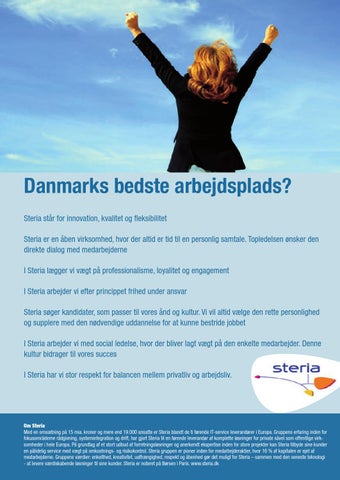 Danmarks bedste arbejdsplads? Steria står for innovation, kvalitet og fleksibilitet Steria er en åben virksomhed, hvor der altid er tid til en personlig samtale. Topledelsen ønsker den direkte dialog med medarbejderne I Steria lægger vi vægt på professionalisme, loyalitet og engagement I Steria arbejder vi efter princippet frihed under ansvar Steria søger kandidater, som passer til vores ånd og kultur. Vi vil altid vælge den rette personlighed og supplere med den nødvendige uddannelse for at kunne bestride jobbet I Steria arbejder vi med social ledelse, hvor der bliver lagt vægt på den enkelte medarbejder. Denne kultur bidrager til vores succes I Steria har vi stor respekt for balancen mellem privatliv og arbejdsliv.