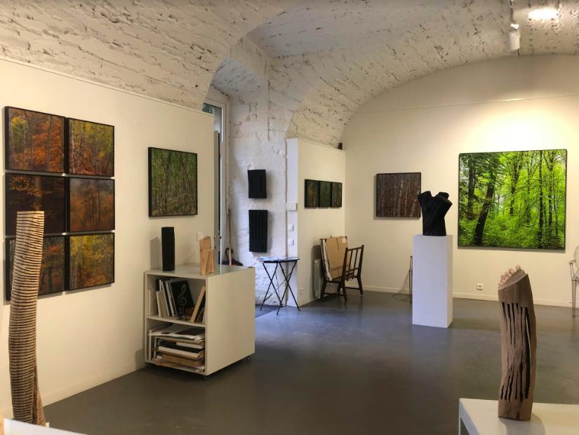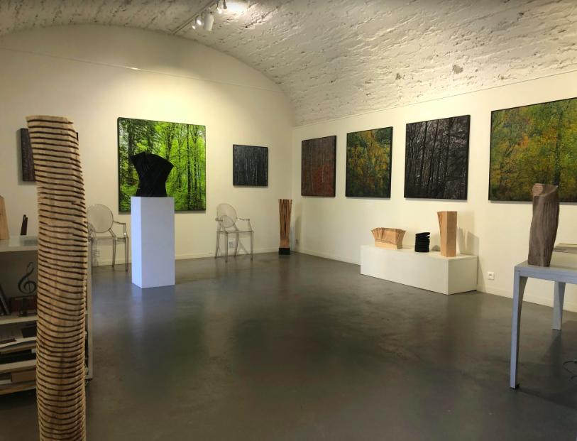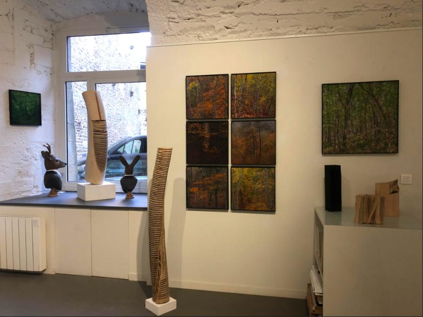 La forêt de Didier Goupy semble au départ impénétrable, presque inquiétante, on l’apprivoise doucement au même titre que le photographe l’apprivoise, elle finit par nous envelopper et nous habiter, on s’y retrouve finalement comme happée. L’oeil du photographe nous apporte la lumière qui peu à peu traverse cette forte densité. L’approche des forêts de Didier Goupy est fascinante et très intense, presque impressionniste et donne parfois l’illusion d’une peinture. Yves Tilly, sculpteur, lui aussi laisse passer la lumière dans la densité du bois, celui de ses sculptures ! C’est ainsi que j’ai voulu associer le travail de l’un avec le travail de l’autre. Le sculpteur mélange avec bonheur l’art de la botanique et de la philosophie dans son processus créatif. Yves Tilly sculpte le bois lorsqu’il est encore vert et c’est en séchant, en perdant la sève, que le bois se transforme à nouveau, de manière aléatoire, réalisant des contrastes entre le plein et le vide et laissant passer la lumière à travers les vides.