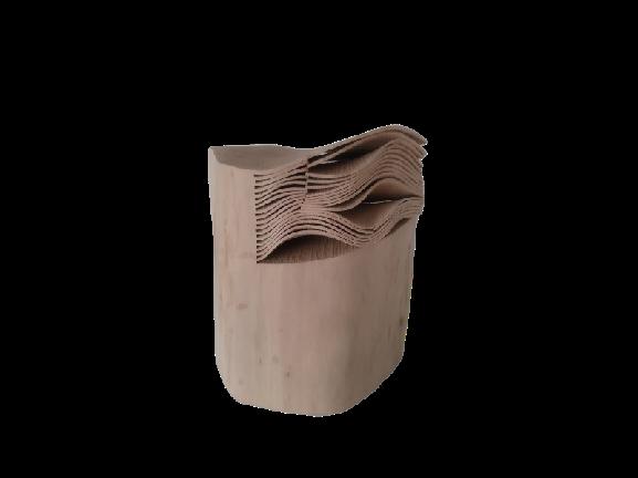 Chaque pièce de bois a été récupérée lors de la taille où l’abattage d’un arbre sur la presqu’ile de Rhuys où le sculpteur a son atelier. Il entaille le bois encore vert, avant que la perte de sève en déforme la rectitude. En séchant, le bois se transforme à nouveau. Il peut s’ouvrir comme un livre ou prendre une forme plus architecturale.