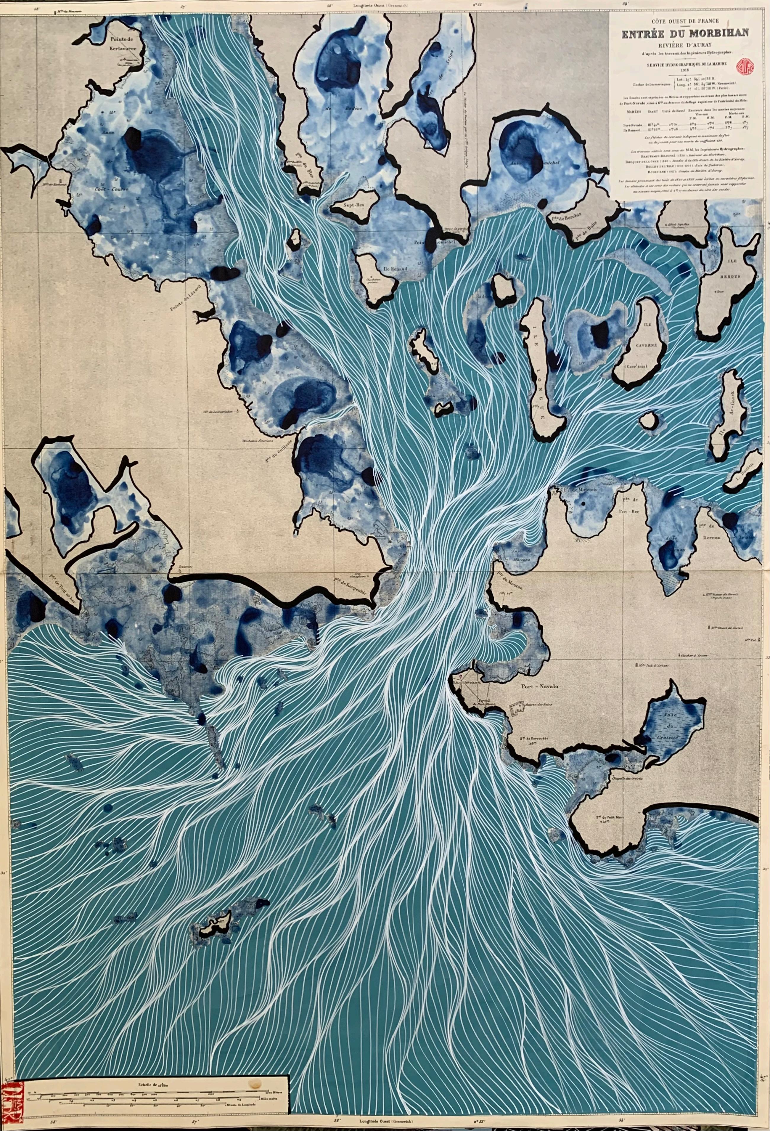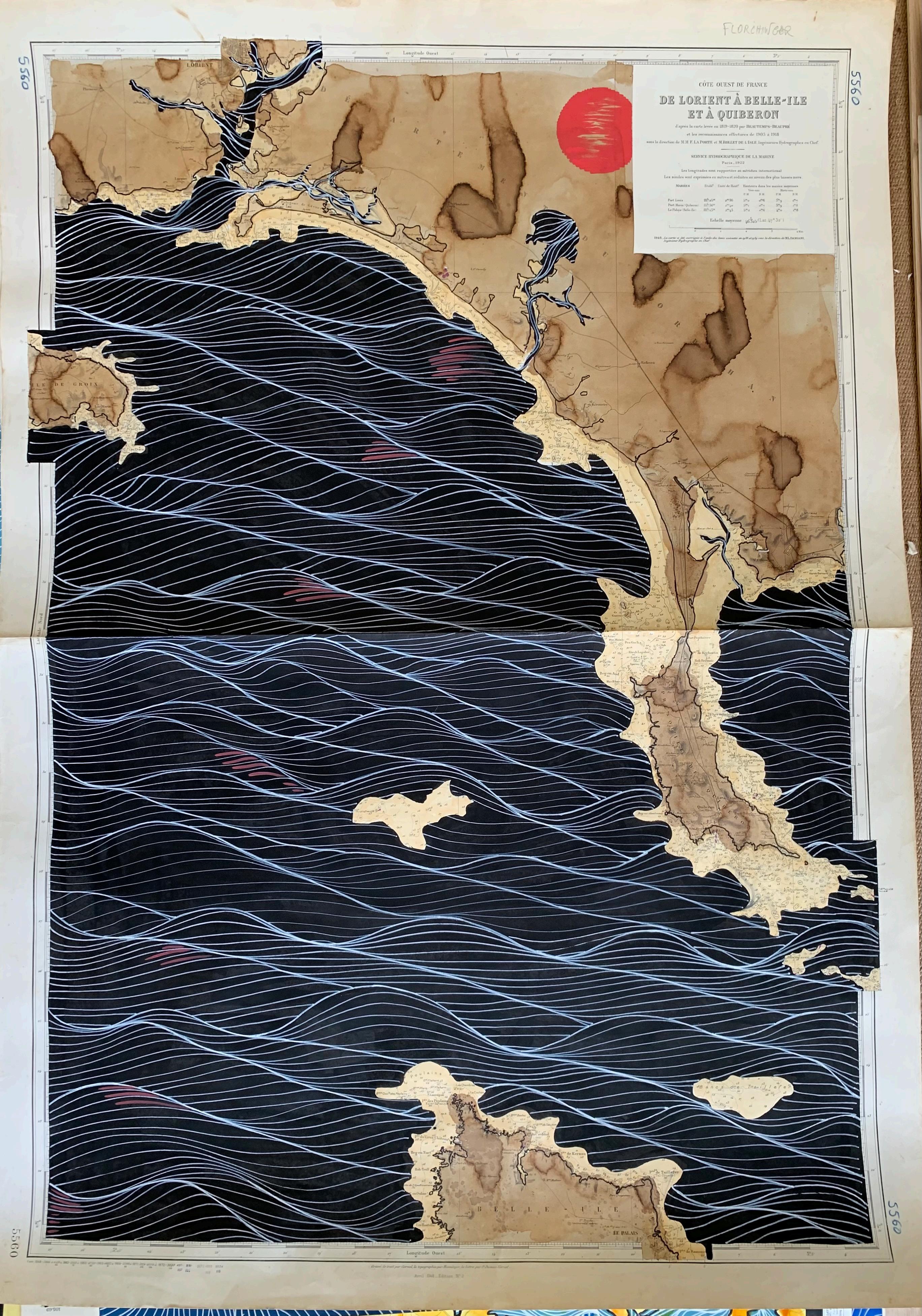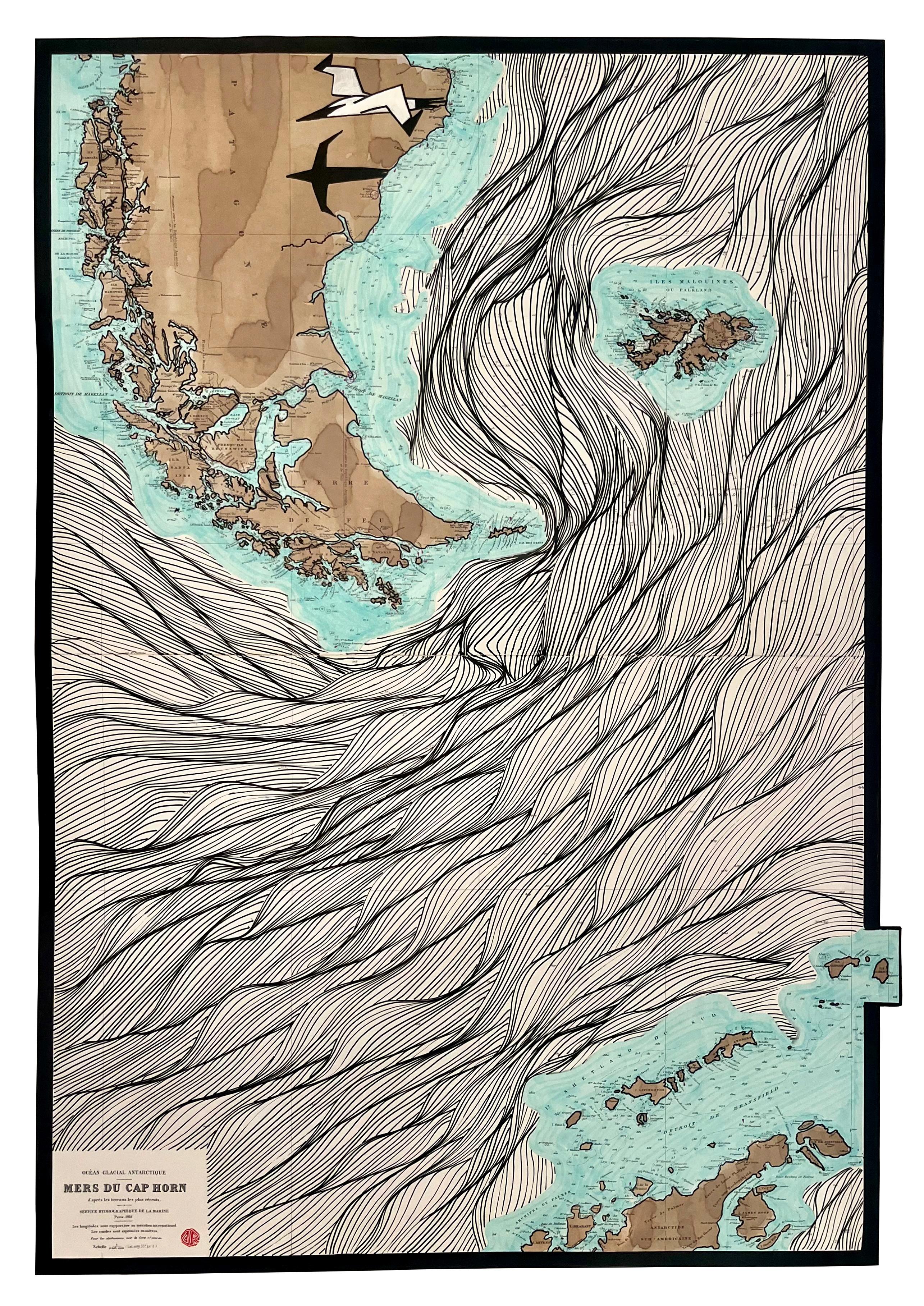 La carte vit, se plie, se corne, se chiffonne … Elle se couvre parfois d’annotations, de traces de sel et de temps. Elle devient mémoire des routes suivies et aventures oubliées. C’est là que Clément intervient en dernier, sur ces cartes retrouvées, ces fragments d’océans et de territoires déjà marqués par l’histoire et la navigation. Il appose son geste délicat et graphique, poétique, qui parfois semble faire mouvoir la carte ou parfois nous amène à la méditation, au rêve. On se perd avec bonheur dans ses lignes douces et fluides.
