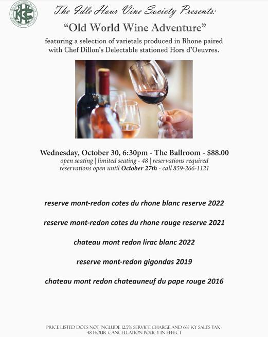 Old-World Wine Adventure: Join us at Idle Hour on Wednesday, October 30, at 6:30 pm in the Ballroom for a special evening celebrating the wines of the Rhône region. Enjoy a unique dining experience as Chef Dillon presents delectable hors d’oeuvre stations to complement the rich flavors of Rhône’s renowned varietals For more information, please see the attached event flyer or call 760-272-5600