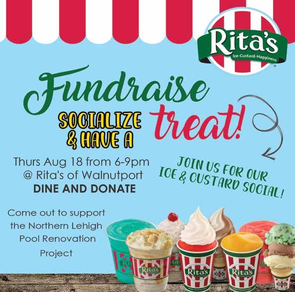Moore Township Community Days- Friday, Aug. 19 and Saturday, Aug. 20 at Moore Twp. Rec. Center. Bands, food, vendors, bingo, fireworks and more. Nazareth Farmers’ Market- Open Saturdays May-Oct. from 9 a.m. to 1 p.m. in Center Square. Northampton Area Food Bank- Food distribution first three Thurs days from 5 to 7 p.m. and second and third Saturday 9 to 11:30 a.m. 1601 Canal St. Northampton Borough Crime Watch Meeting- Typically held sec ond Wednesday of each month at 7 p.m. at the Northampton Borough Fire Dept. Northampton Farmers’ Market- Open Tuesdays May-Sept. from 3 to 6:30 p.m. at Municipal Park. Siegfried Log Cabin- Open Saturday, Aug. 20 from 10 a.m. to noon. 448 West Main St., Bath. Volunteers needed, call 570-325-2233 FMI. Siegfried Railroad Station Museum- Open third Sunday of each month May through October from 1 to 4 p.m. Spuds and Suds- Saturday, August 20 from noon to 7 p.m. in the Bath Borough. Stay tuned FMI.