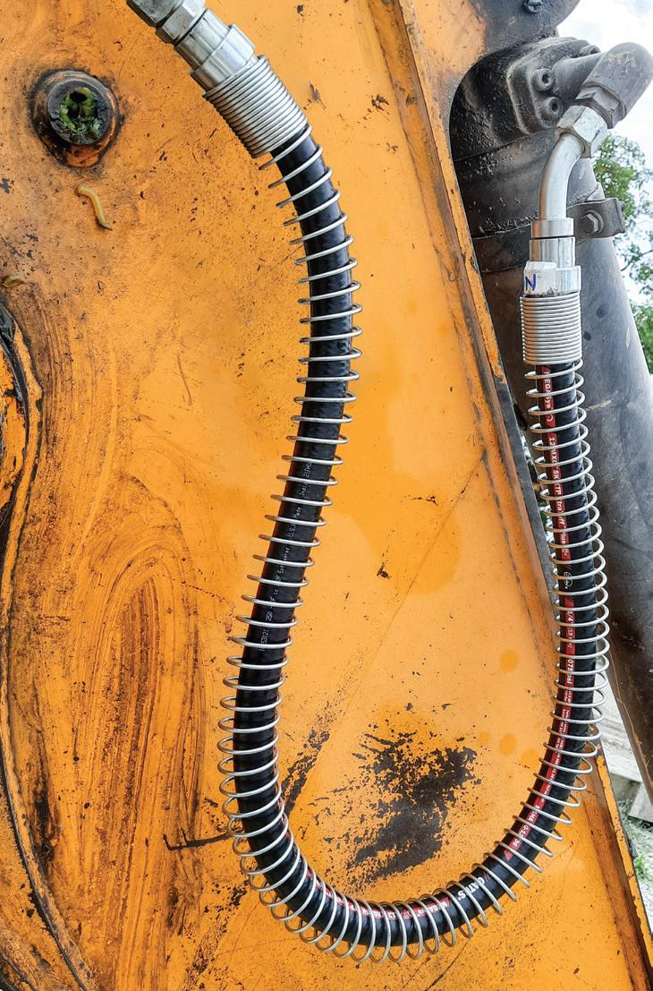 As a material, rubber has many properties that make it ideal for hydraulic hoses. It is strong but flexible, it can withstand extreme temperatures, and it resists degradation from oils and other materials present in heavyduty systems. For these reasons, rubber is an excellent choice to cover the hose when the cover’s primary purpose is to protect the hose reinforcement from damage. While standard rubber covers do a good job of protecting the hose from normal environmental conditions, some applications experience severe abrasion caused by poor hose routings, severe applications, congested hydraulic systems, or interactions with other machine components in dynamic installations. Unfortunately, external abrasion has been identified as one of the most common causes of premature hose failure. Most hose manufacturers make